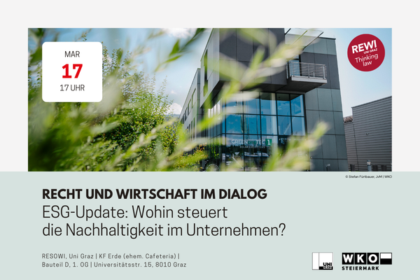 Die Rechtswissenschaftliche Fakultät der Universität Graz und die WKO Steiermark laden Sie herzlich zur nächsten Ausgabe von „Recht und Wirtschaft im Dialog“ zum Thema „ESG-Update: Wohin steuert die Nachhaltigkeit im Unternehmen?“ ein, die am 17. März 2026 um 17:00 Uhr im KF Erde (ehemals RESOWI Cafeteria), Eingang im Bauteil D, 1. Stock, Universitätsstraße 15, 8010 Graz, stattfindet.