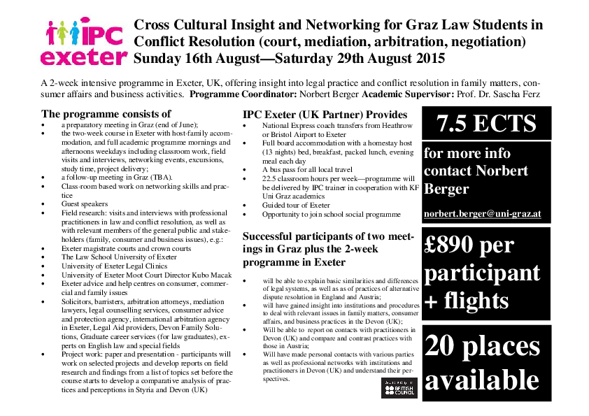 Universität Graz Rechtswissenschaften Neuigkeiten Anmeldung läuft: Kulturübergreifende Einblicke und Netzwerken für Jus-Studierende in Konfliktbearbeitungsverfahren bei IPC Exeter