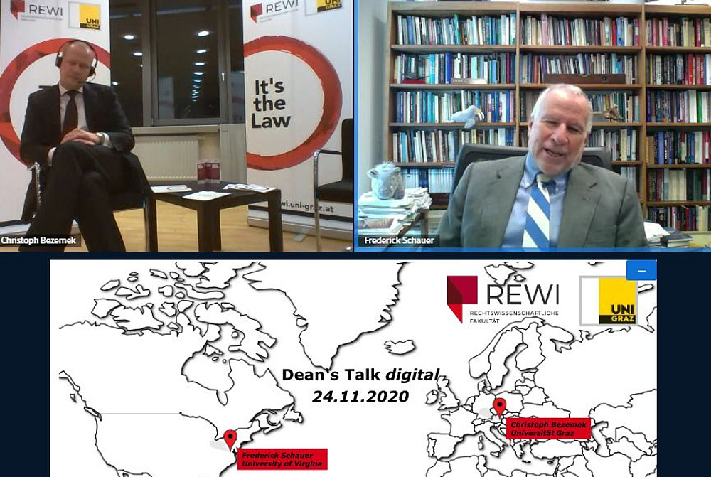 Dem Dean’s Talk wurde seine bereits für März geplante physische Premiere durch die aktuelle Situation mehrfach verwehrt. Die REWI öffnete ihm daher am 24.11. einen virtuellen Gesprächsraum: REWI-Dekan Christoph Bezemek begrüßte im ersten Dean’s Talk digital mit Frederick Schauer (David and Mary Harrison Distinguished Professor of Law, University of Virginia School of Law) einen der profiliertesten Verfassungsrechtler und Rechtstheoretiker der USA und sprach mit ihm über die Situation nach den Präsidentschaftswahlen in den USA, die oft kolportierte Spaltung des Landes oder Meinungsfreiheit in sozialen Medien.