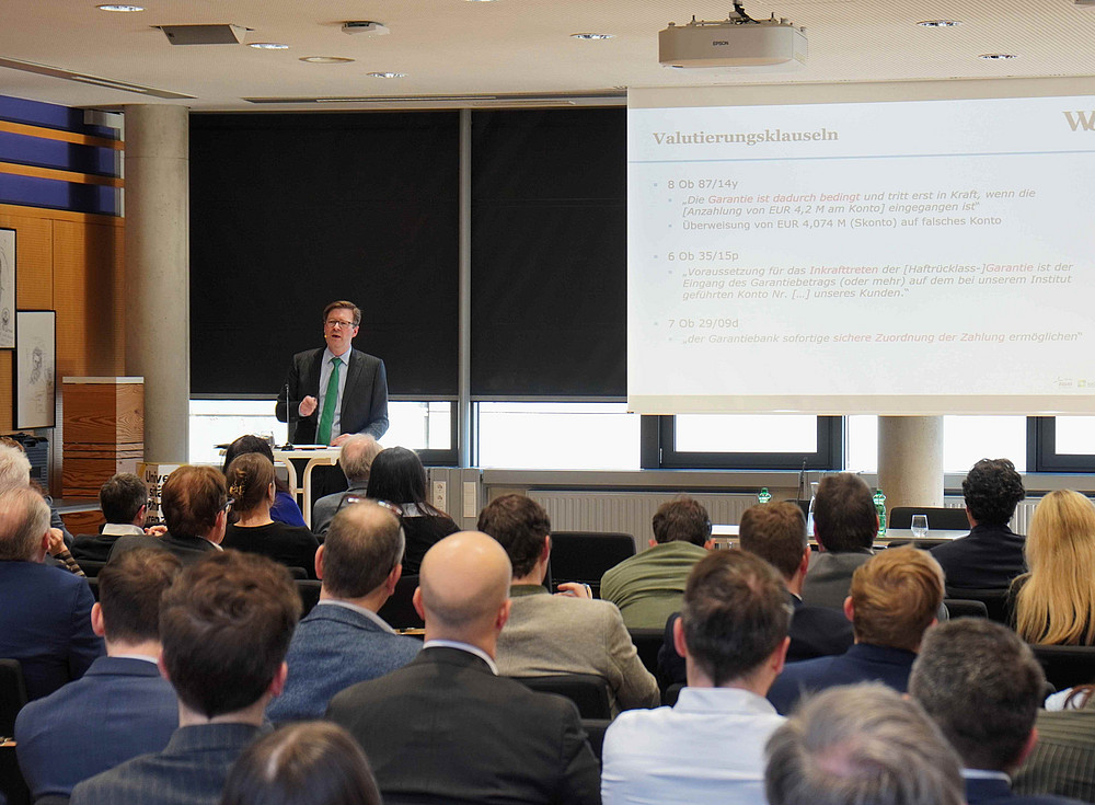 Flankierend zu diesem Vortrag stellte RA Mario Leistentritt in seinem Impulsvortrag einen Fall zu einer strittigen Garantieklausel aus der Praxis vor, RA Clemens Jaufer gab Einblick in die oft entgegengesetzte Interessenlage der Vertragsparteien bei der Vereinbarung von Patronatserklärungen. Abschließend zeigte RA Alexander Painsi Besonderheiten bei der Vereinbarung persönlicher Sicherheiten im grenzüberschreitenden Kontext auf.
