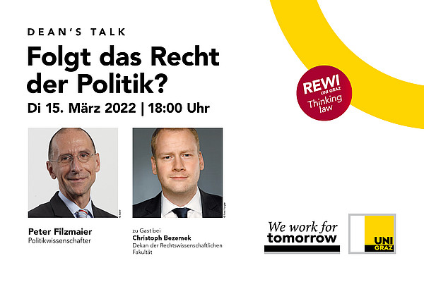 SMS- und Chatprotokolle brachten in den letzten Monaten ans Licht, wie dicht verwoben die Netzwerke der Einflussreichen in unserem Land sind. Man staunt, wie weit sich die Kreise ziehen, und fragt, welche Auswirkungen das hat, etwa auf die Justiz? Folgt das Recht der Politik? Zu dieser Frage diskutiert Christoph Bezemek am 15. März, ab 18 Uhr, mit dem Politikwissenschafter Peter Filzmaier im Dean's Talk. Seien Sie live dabei im RESOWI-Zentrum (Bauteil A, 2. Stock, Anmeldung erforderlich an rewi.anmeldung@uni-graz.at) oder via Livestream unter diesem Link.