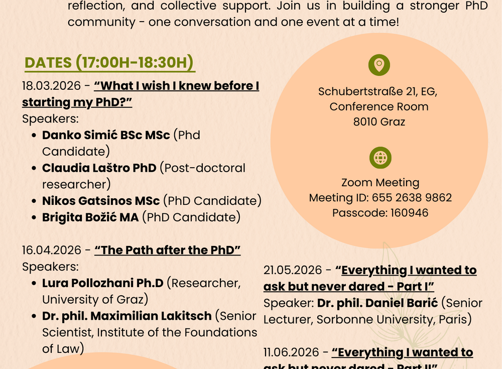 Whether you are at the beginning of your PhD or approaching submission, these events offer space for honest exchange, critical reflection, and collective support. Join us in building a stronger PhD community - one conversation and one event at a time!