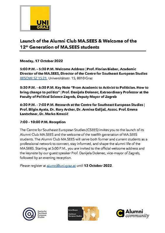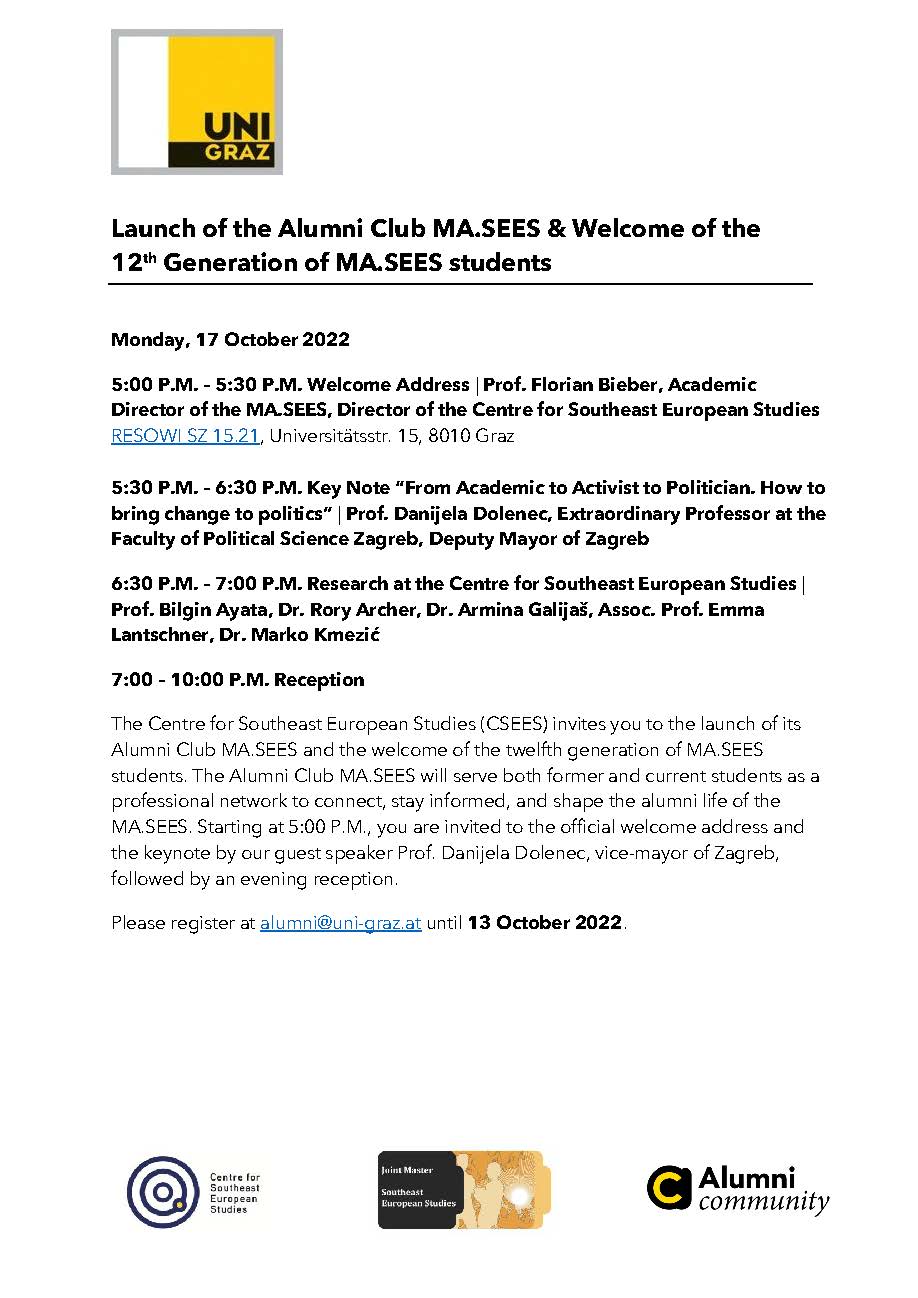 The Centre for Southeast European Studies (CSEES) invites you to the launch of its Alumni Club MA.SEES and the welcome of the twelfth generation of MA.SEES students. The Alumni Club MA.SEES will serve both former and current students as a professional network to connect, stay informed, and shape the alumni life of the MA.SEES. Starting at 5:00 P.M., you are invited to the official welcome address and the keynote by our guest speaker Prof. Danijela Dolenec, vice-mayor of Zagreb, followed by an evening reception. Please register at alumni@uni-graz.at until 13 October 2022
