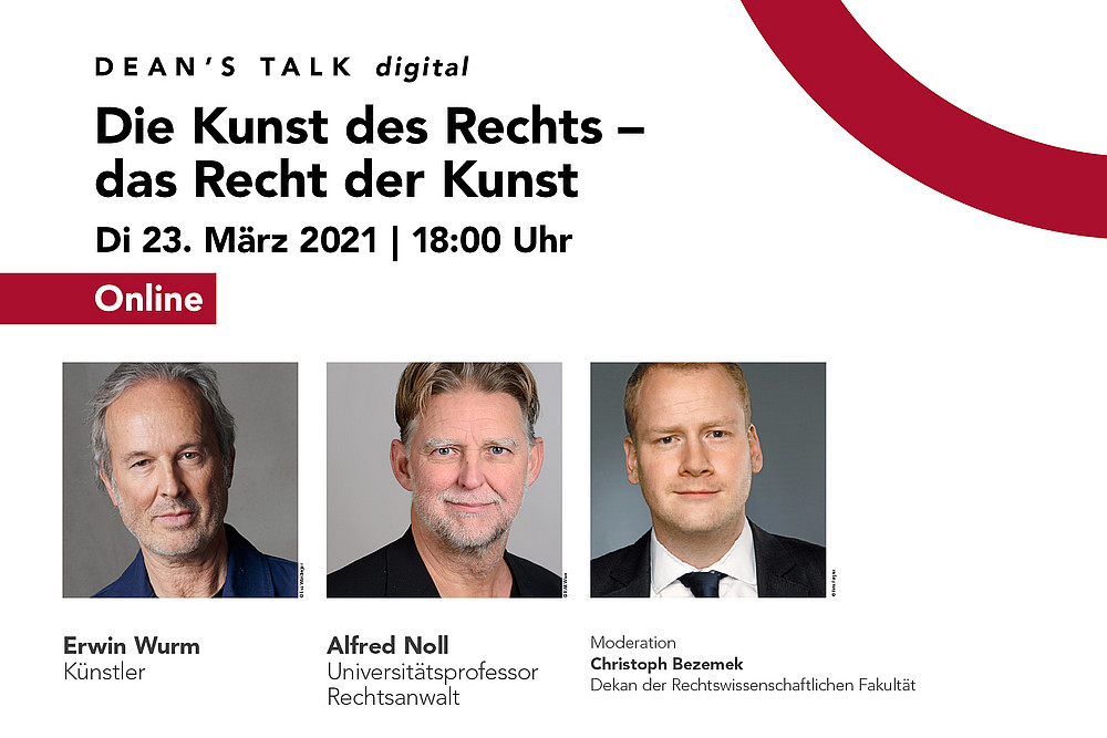 Am 23. März öffnet der virtuelle Raum des Dean's Talk digital wieder seine Türen für eine spannende Diskussion, und das gleich mit zwei prominenten Gästen: Zum Thema „Die Kunst des Rechts - das Recht der Kunst“ begrüßt REWI-Dekan Christoph Bezemek den Künstler Erwin Wurm und den Rechtsanwalt und Universitätsprofessor Alfred Noll.