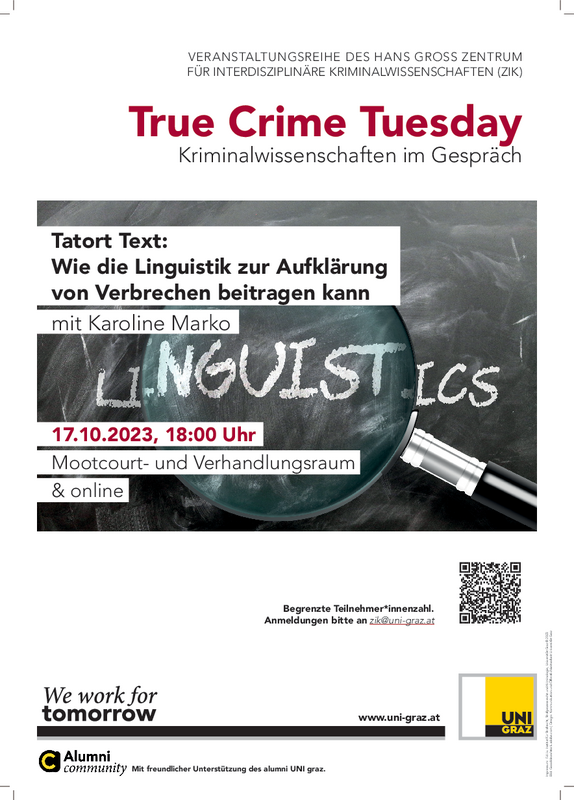 Im Rahmen des Hans Gross Zentrums für interdisziplinäre Kriminalwissenschaften (ZiK) am Institut für Strafrecht, Strafprozessrecht und Kriminologie wurde die Veranstaltungsreihe „True Crime Tuesday“ ins Leben gerufen.