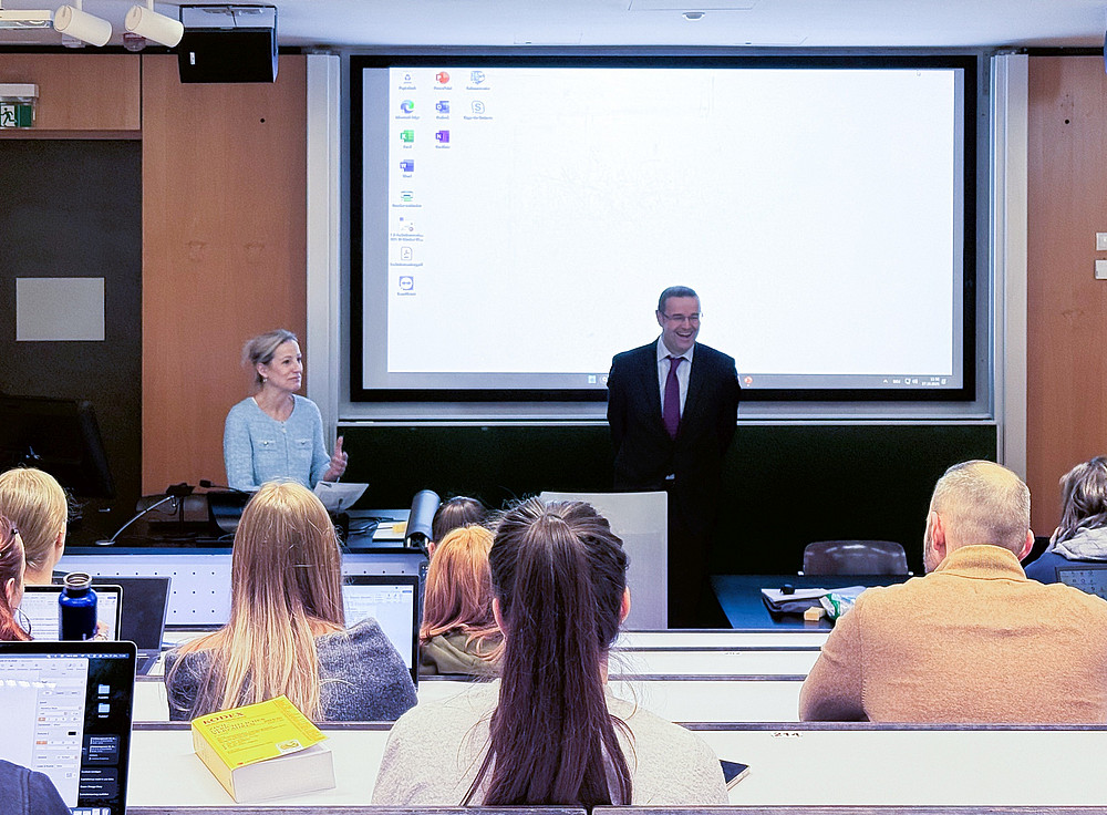 Bernd-Roland Killmann studierte an der Universität Graz, war als Vertragsassistent am Institut für Zivilverfahrensrecht und Insolvenzrecht tätig und ist seit 1997 Beamter bei der europäischen Kommission. Seit 2008 ist er Mitglied des juristischen Dienstes und vertritt in dieser Funktion unter anderem die europäische Kommission in den Vorabentscheidungsverfahren vor dem EuGH. In seinem äußerst kurzweiligen Gastvortrag in der VO Zivilverfahrens- und Insolvenzrecht ließ Killmann die Zuhörerinnen und Zuhörer an seine praktischen Erfahrungen zum Vorabentscheidungsverfahren teilhaben: Am Beispiel eines rezenten Falls zur Ausbildung von Rechtsanwaltsanwärter:innen (EuGH C‑807/23, Jones Day, ECLI:EU:C:2025:234), an dem er als Vertreter der europäischen Kommission beteiligt war, erläuterte er den interessierten Studierenden und zahlreichen weiteren Gästen die einzelnen Schritte von der Vorlage durch ein Gericht eines Mitgliedsstaats bis hin zum Urteil des EuGH.