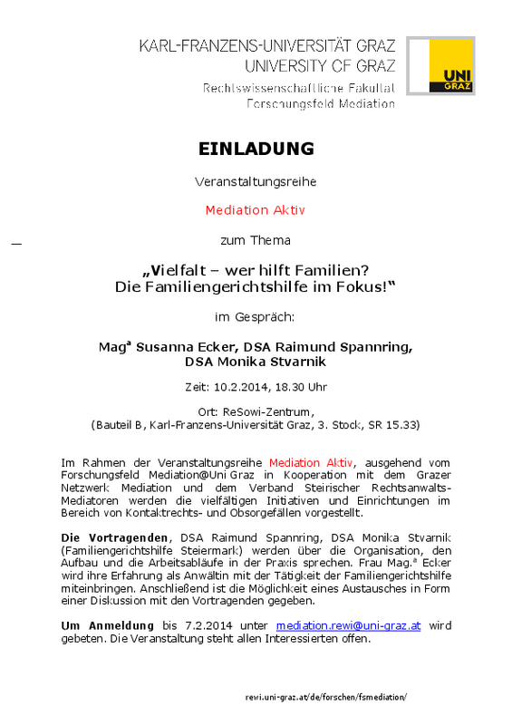 Um Anmeldung bis 7.2.2014 unter mediation.rewi(at)uni-graz.at wird gebeten. Die kostenlose Veranstaltung steht allen Interessierten offen.