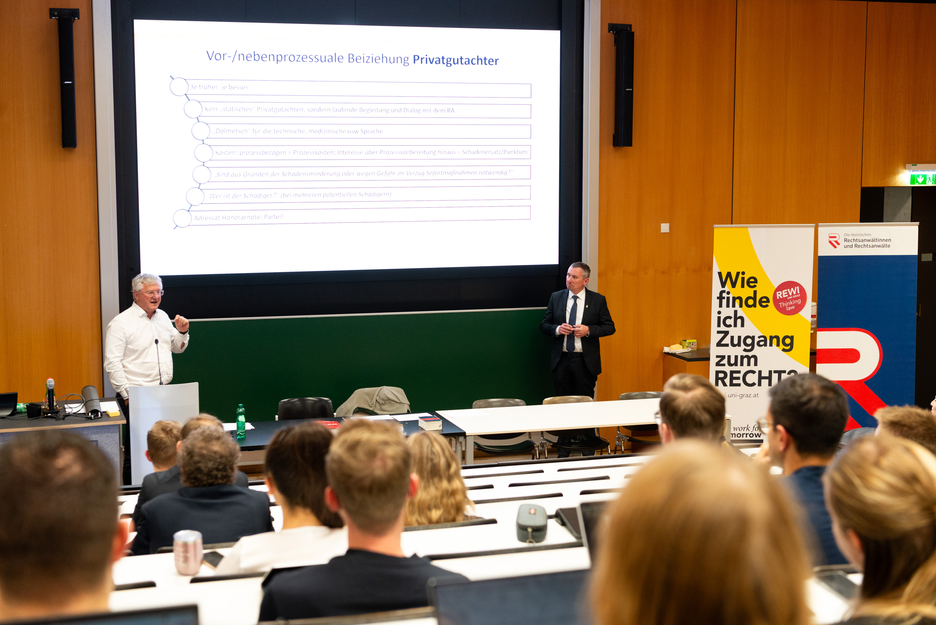 Am 2. Oktober 2025 fand im Rahmen der Veranstaltungsreihe „BERUFSRECHT on demand“ wieder ein praxisnaher Vortrag in Kooperation mit der Steiermärkischen Rechtsanwaltskammer statt. Begrüßt wurden die Teilnehmer:innen von Bettina Nunner-Krautgasser (Co-Leiterin des ZBR) und RA Michael Kropiunig (Präsident der Stmk RAK). Unter dem Titel „Der Zivilprozess bis zur vorbereitenden Tagsatzung“ gewährten dann die erfahrenen Praktiker RA Konstantin Pochmarski und RA Helmut Schmid spannende Einblicke in die vorprozessuale Aufbereitung anwaltlicher Mandate.